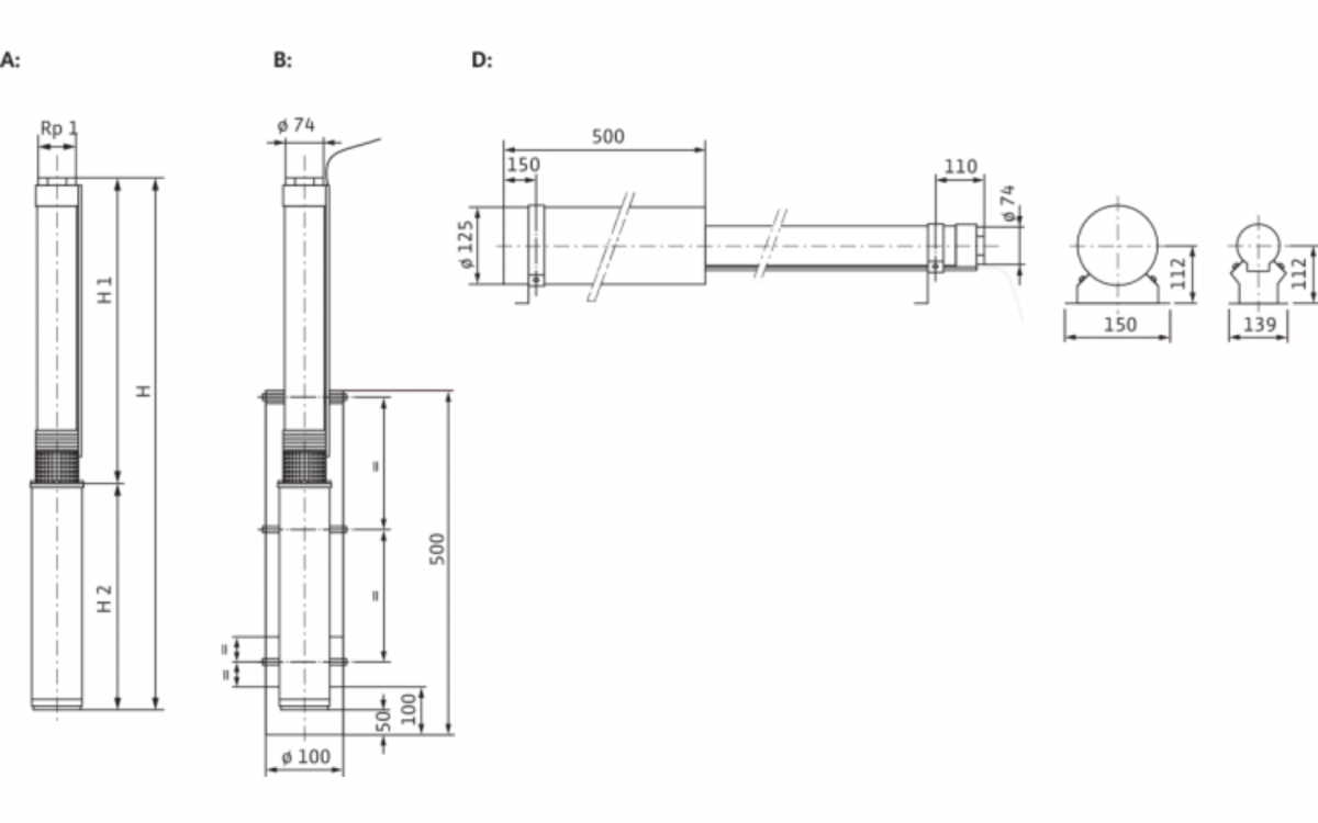 Полностью погружной многоступенчатый насос с радиальными рабочими колесами в секционном исполнении для вертикального или горизонтального монтажа со встроенным обратным клапаном. Стойкий к коррозии электродвигатель прямого пуска для однофазного или трехфазного тока, с заполненным маслом электродвигателем с возможностью перемотки и самосмазывающимися подшипниками. Охлаждение электродвигателя происходит за счет перекачиваемой жидкости. Этот агрегат всегда должен эксплуатироваться в погруженном состоянии. Горизонтальный монтаж выполняется с охлаждающим кожухом. Для перекачивания воды из скважины с максимальной глубиной погружения 150 м и максимальным содержанием песка 50 г/м³.